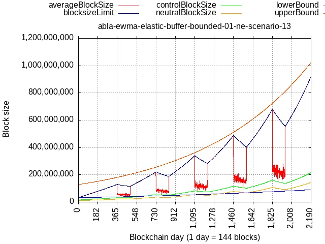 Para el ajuste automático ABLA utiliza la formula matemática llamada Promedio Móvil Exponencialmente Ponderado (EWMA) que analiza continuamente el tamaño promedio de los bloques minados en un marco de tiempo predefinido.