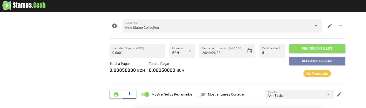 Una vez tenemos todo, debemos ingresar la cantidad que se quiera reclamar por cada estampilla, en nuestro ejemplo 100000 satoshis (0.001 BCH), la herramienta ofrece la opción de elegir la moneda (el valor será convertido a BCH para la financiación). Por último se puede ingresar una fecha límite, no es necesario porque no tiene otro uso que el de ser impreso en las estampillas.